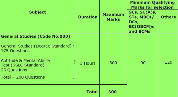 General English (S.S.L.C. Standard) (100 questions) + General Studies (Degree Standard)(75 questions) &Aptitude and Mental Ability Test (S.S.L.C. Standard) (25 questions)